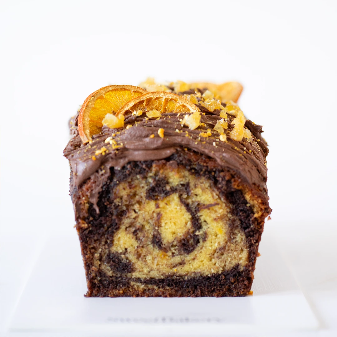 Bizcocho marmolado, una combinación perfecta de chocolate intenso y naranja vibrante, con un crema de cacao aromatizada con naranja y trocitos de naranja confitada. ¡Un postre único y lleno de sabor, para endulzar tu Navidad!